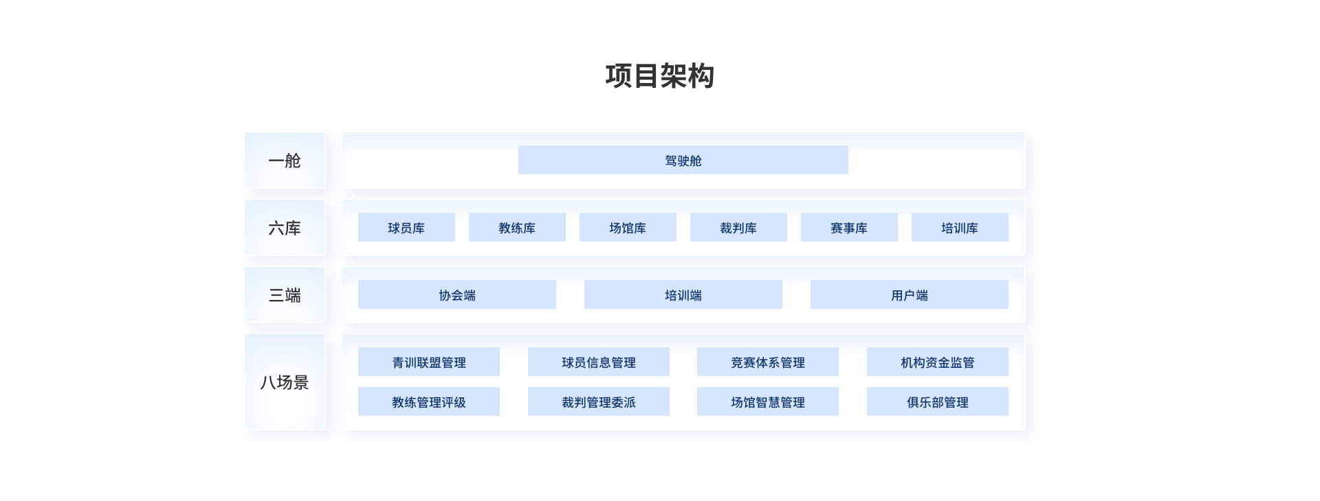 通过省市县三级配置,解决数据生产问题,让数据流通起来为产业加持。通过AI赋能,建立完善预警与培育机制,真正实现足球大脑。建成一舱6库8场景的整体架构,1个省市区3级监测驾驶舱,球员库、教练库、场馆库、裁判库、赛事库、机构库等6类信息库,青训联盟、球员注册、竞赛体系、智慧场馆等8个应用场景。