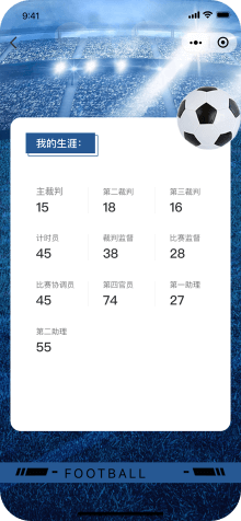 记录裁判获证日期、所属协会等基本信息。裁判可查询委派给自己的赛事,可进行球赛信息的登记等功能。可对裁判参与的赛事进行汇总统计。