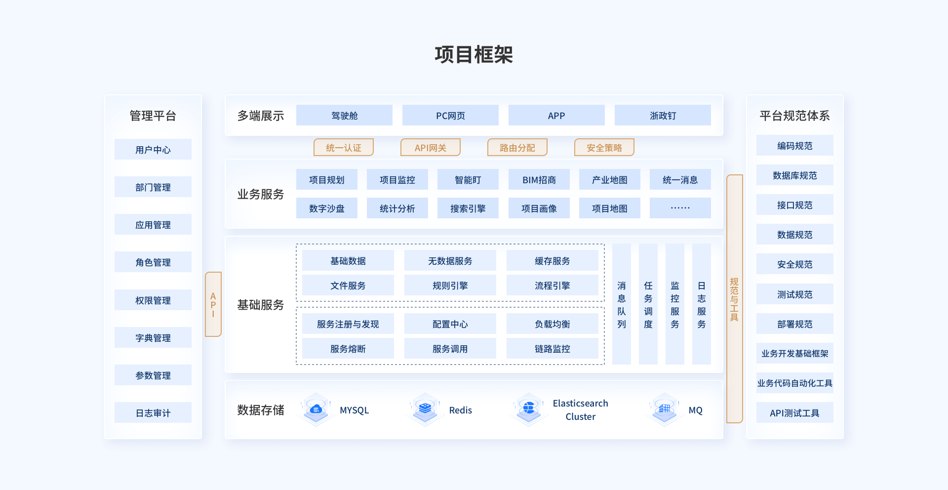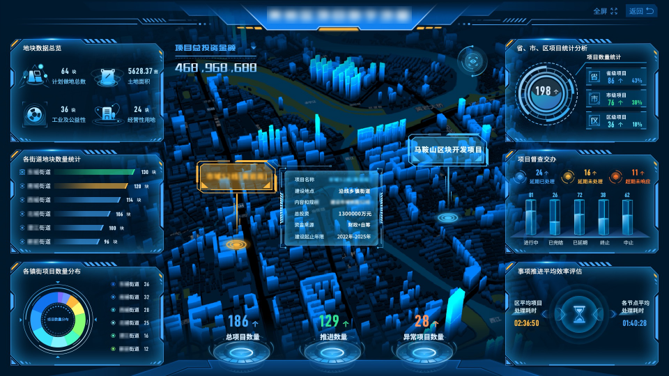 项目智管全流程服务平台是一个发改、自规、环保等多部门共享的信息平台,通过打通政府投资项目数据,实现部门联动,并搭建地块信息库,打造区块开发信息库,实时查看土地做地、储备、出让情况,同时建立监管机制,通过项目码贯通项目全过程,实现项目进度管控和追踪。