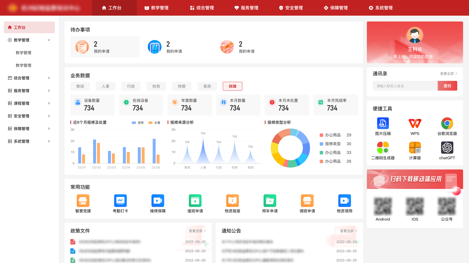 保障管理统计近期用能情况、分析用能异常、统计报事报修处置情况。