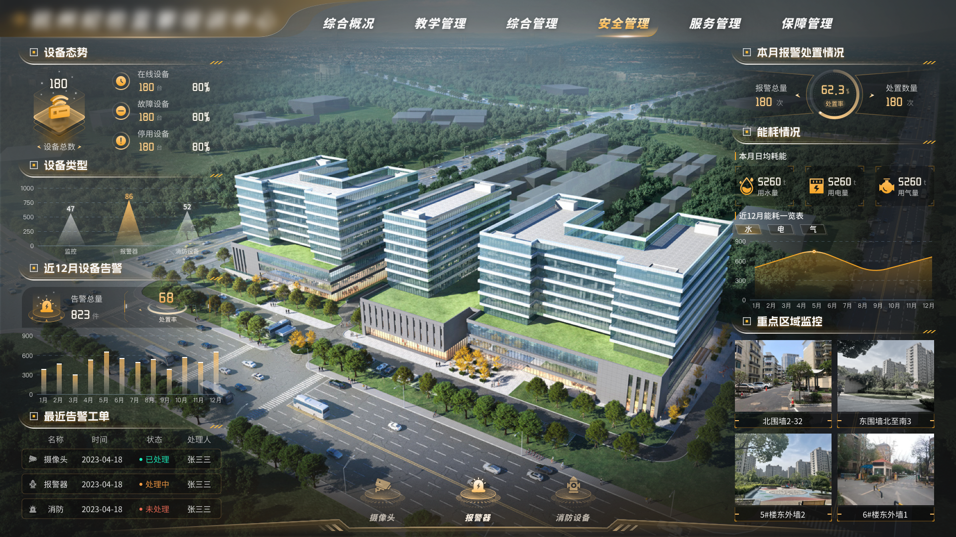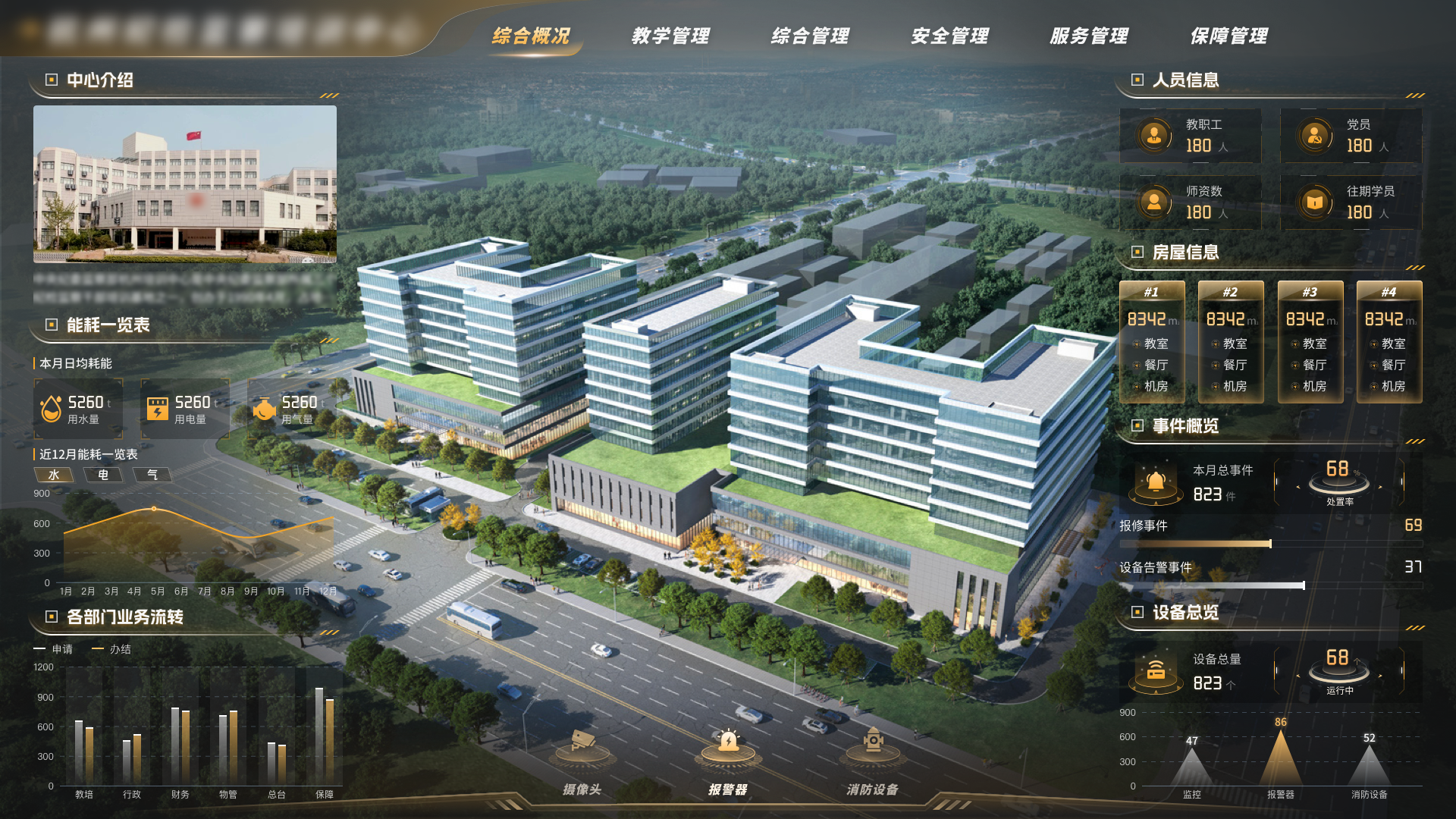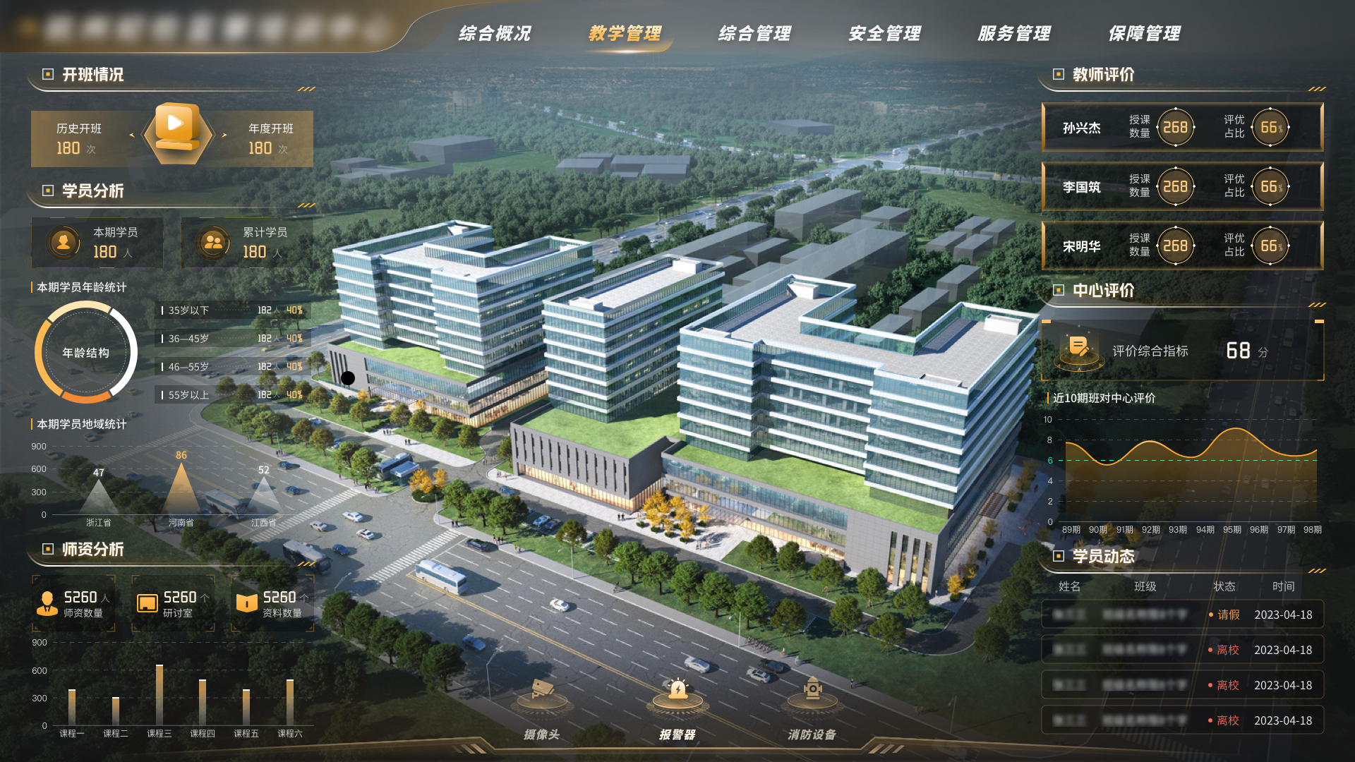 驾驶舱包括教学管理、综合管理、服务管理、安全管理、保障管理五大版面,覆盖中心主要运转参数指标做集中型的呈现。