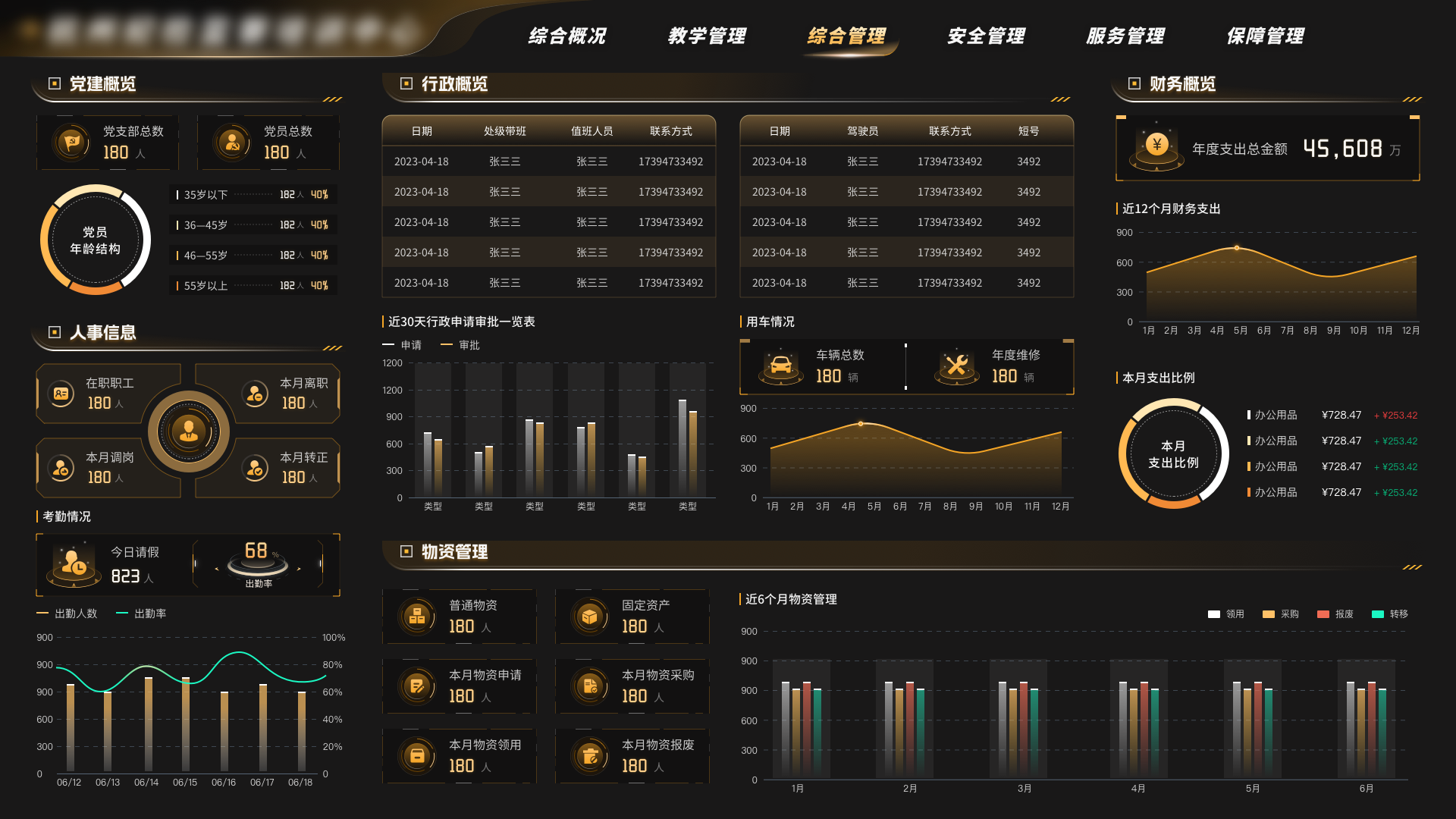综合管理汇聚人事、行政、财务、物管和党建各业务版块事项办理处置情况。