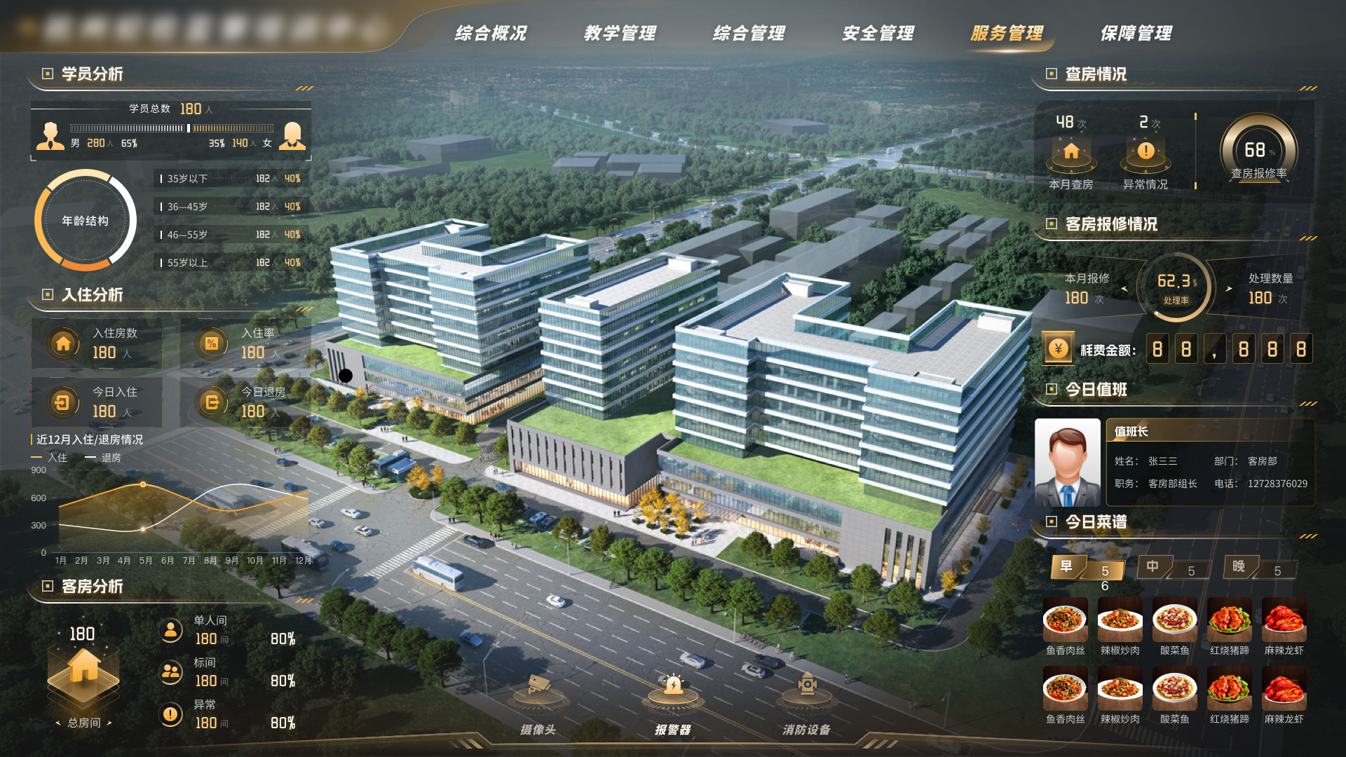 服务管理清晰展示房态及当天值班人员、学员餐厅菜谱,通过三维模型分层分户展示中心学员入住情况。