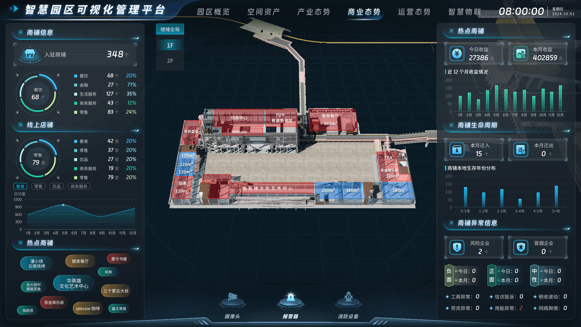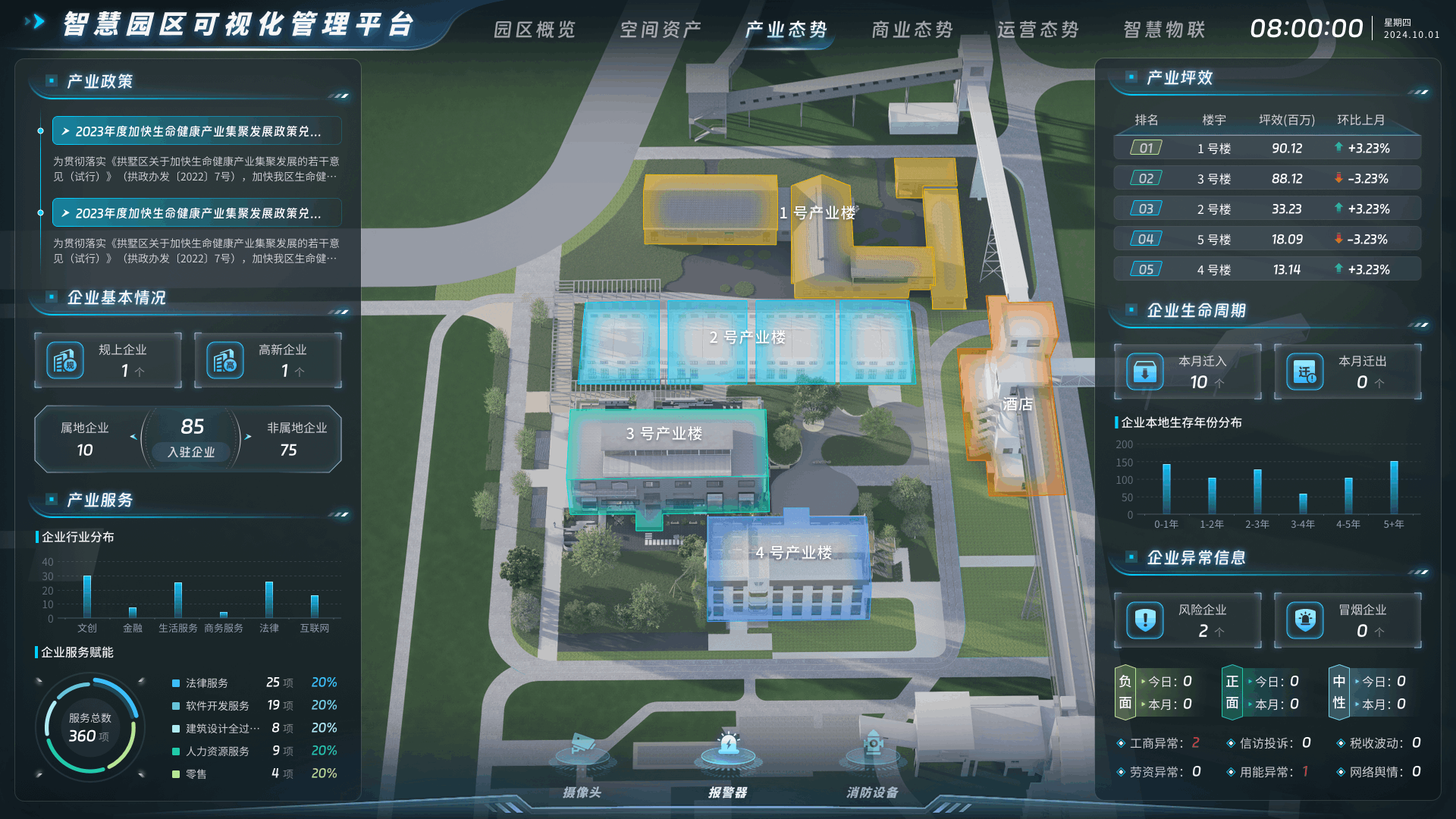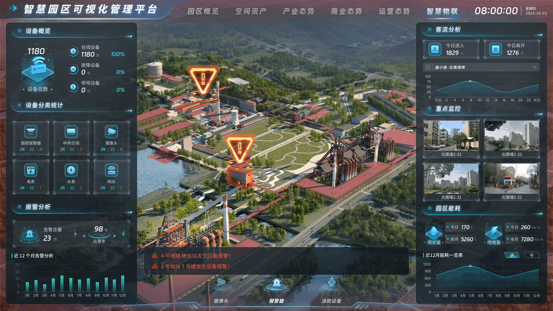 空间资产:搭建园区虚拟模型,直观展示楼宇结构和空间布局,线上了解园区配套设施、招商入驻情况等信息,提升管理效率,实时监测各区域使用情况,实现资源高效配置。产业态势:直观展示园区产业运行情况、产业链分析、政策效果等数据,实时了解产业态势,提升管理效能。对园区产业运行中的潜在风险进行预警,提前制定应对措施。商业态势:驾驶舱实现包括商业数据分析、客流量监测、业态分布、销售趋势预测等,助力管理者科学决策,优化商业布局,提升运营效率,为园区商业发展提供有力支撑。运营态势:监测园区人流量、车流量、设施利用率、活动参与度等多维度数据,为决策提供数据依据,根据人流高峰时段合理调配安保人员、依据设施使用频率安排维护计划等。智慧物联:集成园区消控智能管理平台,实时监控园区消防系统、安全防范等情况,全面展示园区安全态势。具备实时预警、故障排查、远程控制等功能,快速响应。