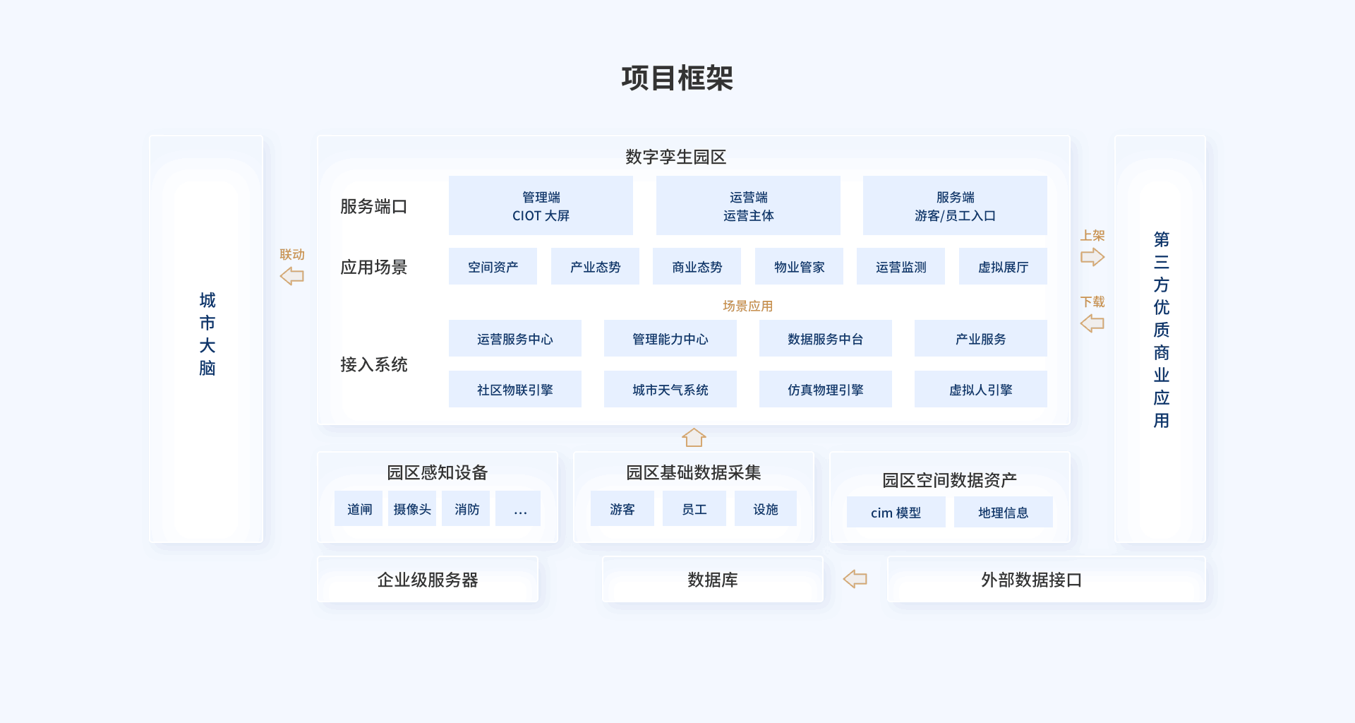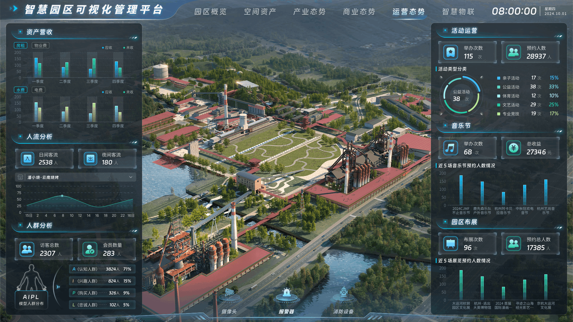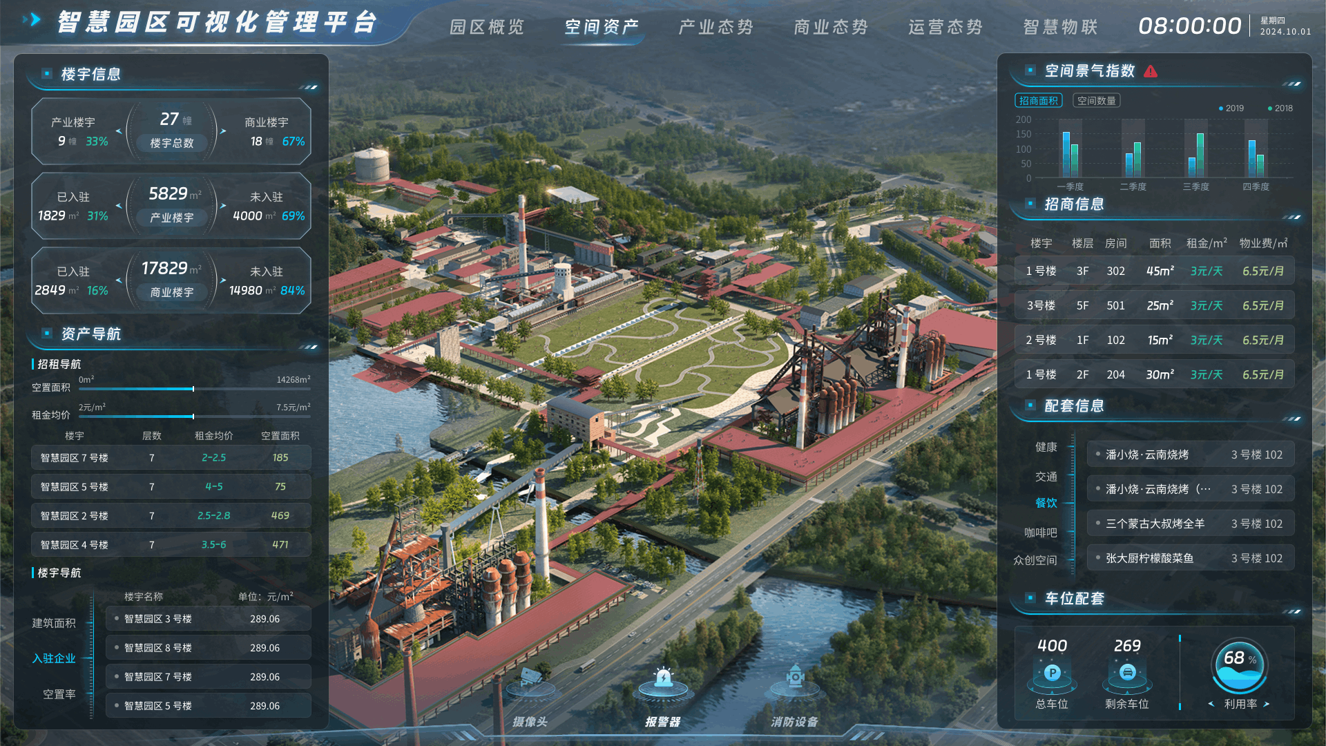 空间资产:搭建园区虚拟模型,直观展示楼宇结构和空间布局,线上了解园区配套设施、招商入驻情况等信息,提升管理效率,实时监测各区域使用情况,实现资源高效配置。产业态势:直观展示园区产业运行情况、产业链分析、政策效果等数据,实时了解产业态势,提升管理效能。对园区产业运行中的潜在风险进行预警,提前制定应对措施。商业态势:驾驶舱实现包括商业数据分析、客流量监测、业态分布、销售趋势预测等,助力管理者科学决策,优化商业布局,提升运营效率,为园区商业发展提供有力支撑。运营态势:监测园区人流量、车流量、设施利用率、活动参与度等多维度数据,为决策提供数据依据,根据人流高峰时段合理调配安保人员、依据设施使用频率安排维护计划等。智慧物联:集成园区消控智能管理平台,实时监控园区消防系统、安全防范等情况,全面展示园区安全态势。具备实时预警、故障排查、远程控制等功能,快速响应。